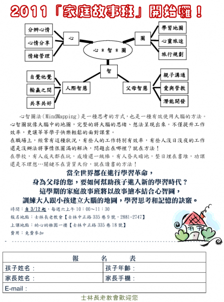 社區「家庭故事班」3/12開課,每週六早上10:00-11:30於幼心幼稚園一樓上課,本期將以故事繪本結合心智圖,學習思考和記憶的訣竅,歡迎填寫報名表向幹事報名。